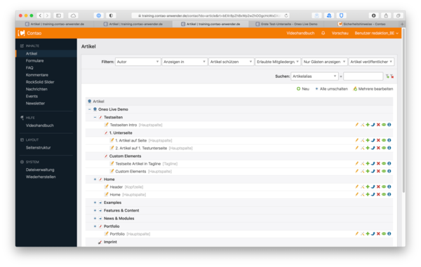 Ein Klick auf „Artikel“ im Bereich INHALTE öffnet eine Ansicht, die der Ansicht in der Seitenstruktur einerseits sehr ähnelt, andererseits aber auch etwas verwirrt. Wenn man in der Seitenstruktur eine neue Seite anlegt, legt Contao ungefragt auch einen gleichnamigen Artikel in der Hauptspalte des Seitenlayouts an. Diesen Artikel sieht man aber nur, wenn man zur Ansicht INHALTE > Artikel wechselt.